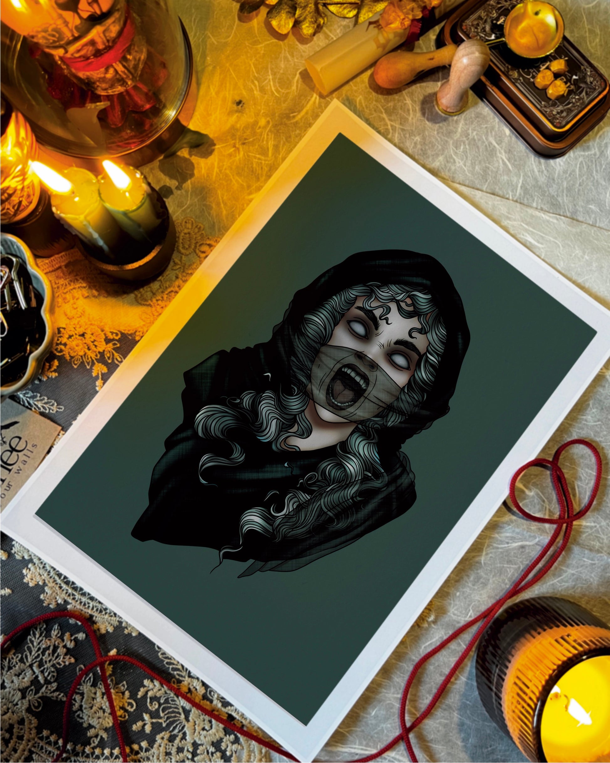A wail that echoes through legend—veiled in shadow, her silent scream carries the weight of prophecy & mourning.